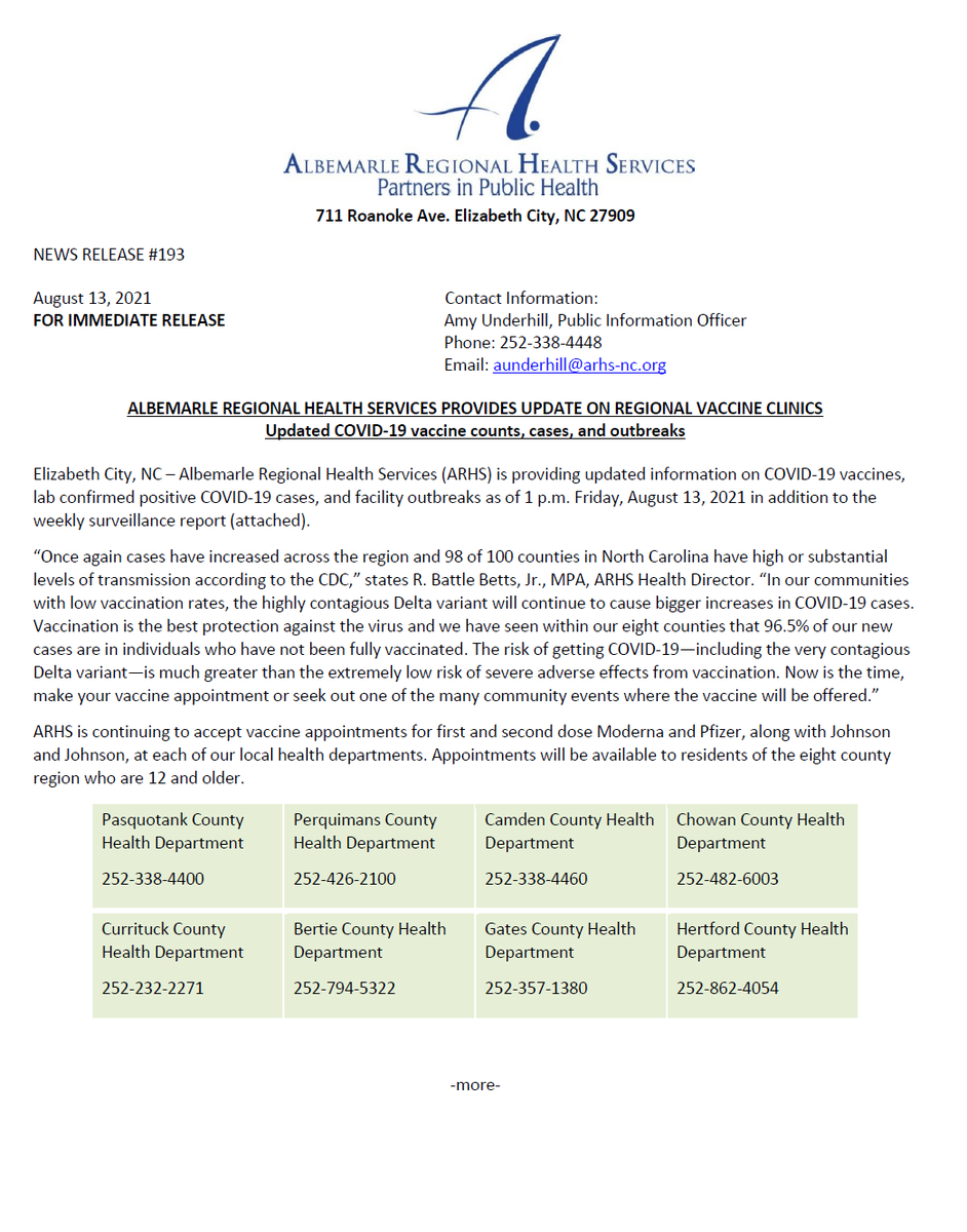 Regional COVID-19 Case Counts. Albemarle Regional Health Services is a Non-emergency Medical Transport VAN specialty provider based out of Elizabeth City North Carolina. Request for Permit Please complete all of the following items.